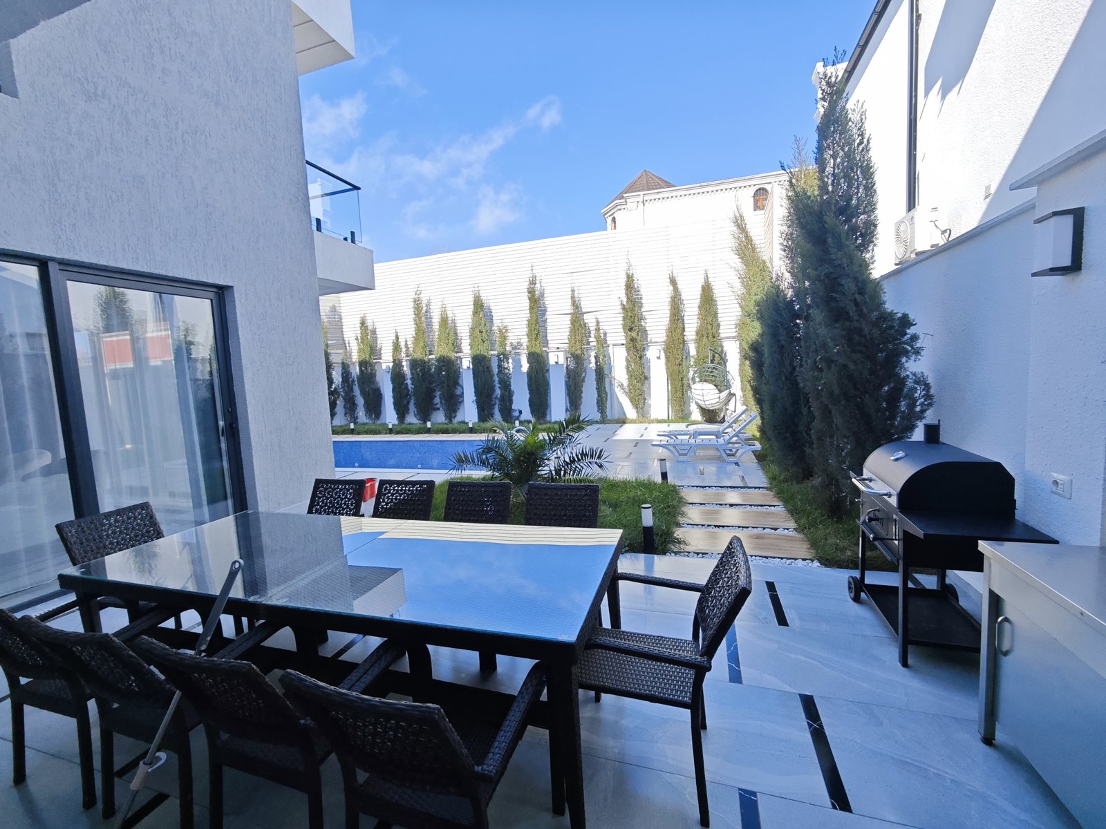 Merkezi yola cemi 150 metr mesafede yerlesen, genish layihə planina malik, seliqeli temir olunmus ve mebelli teklif olunan modern bag evidir.