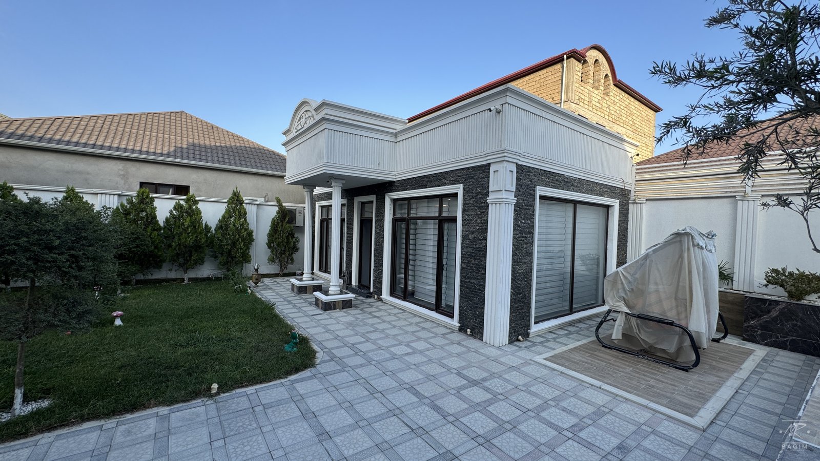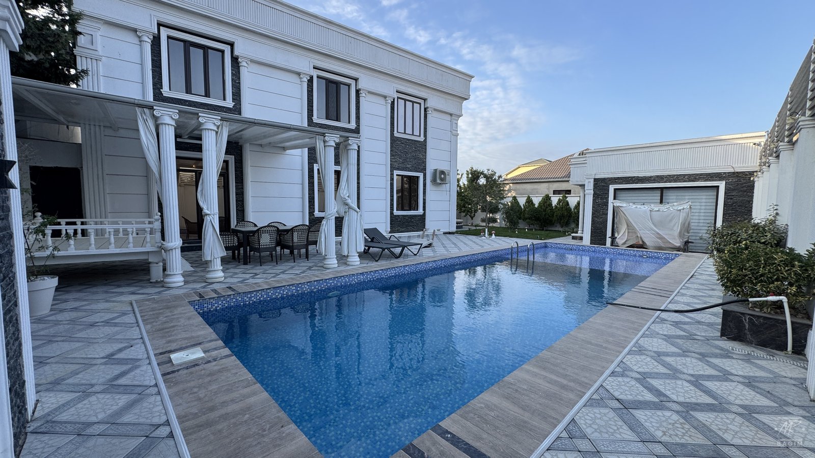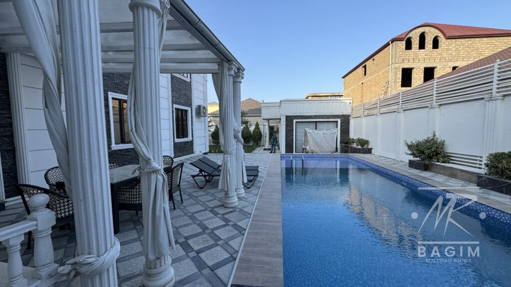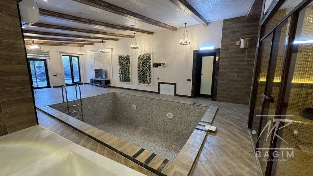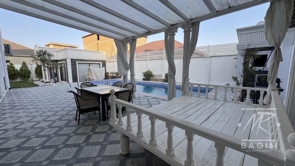 Həyətdə açıq və qapalı hovuzlar, geniş yay mətbəxi (besedka), terrasa çıxış, yaşıllıq və müxtəlif meyvə ağacları mövcuddur. İstər yay, istərsə də qış aylarında ailəvi istirahət üçün mükəmməl şərait yaradılıb.