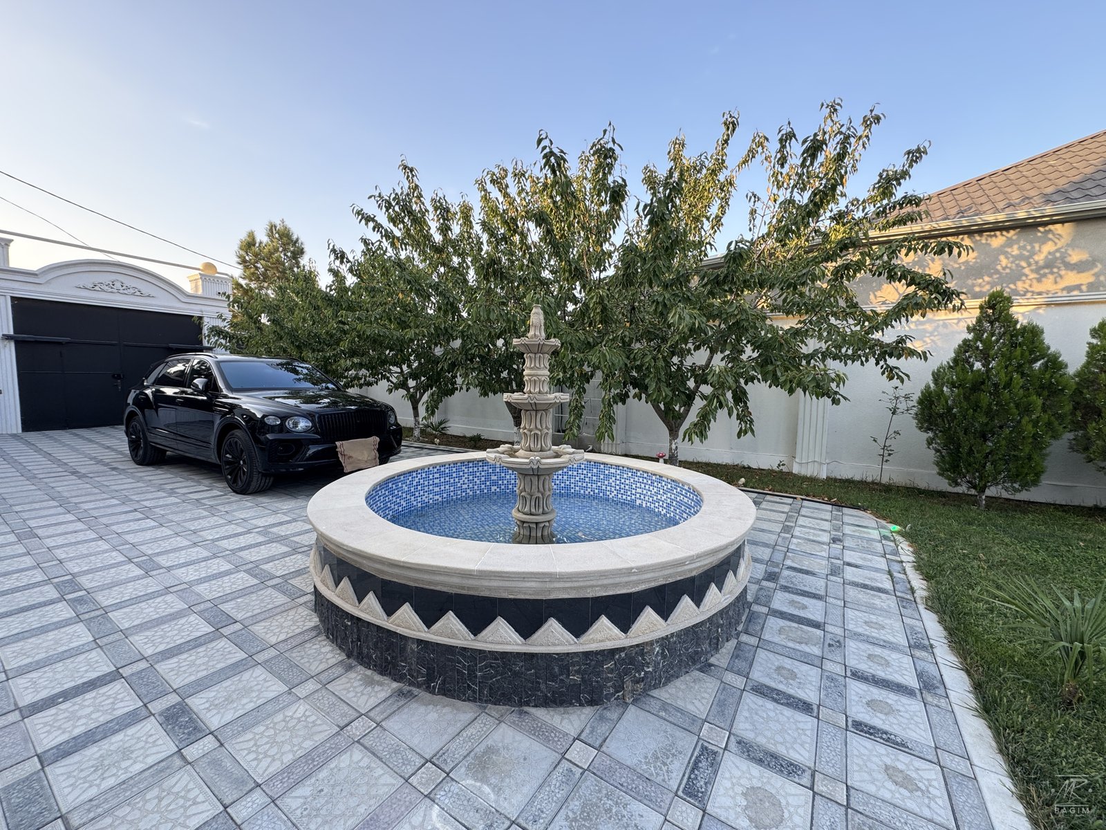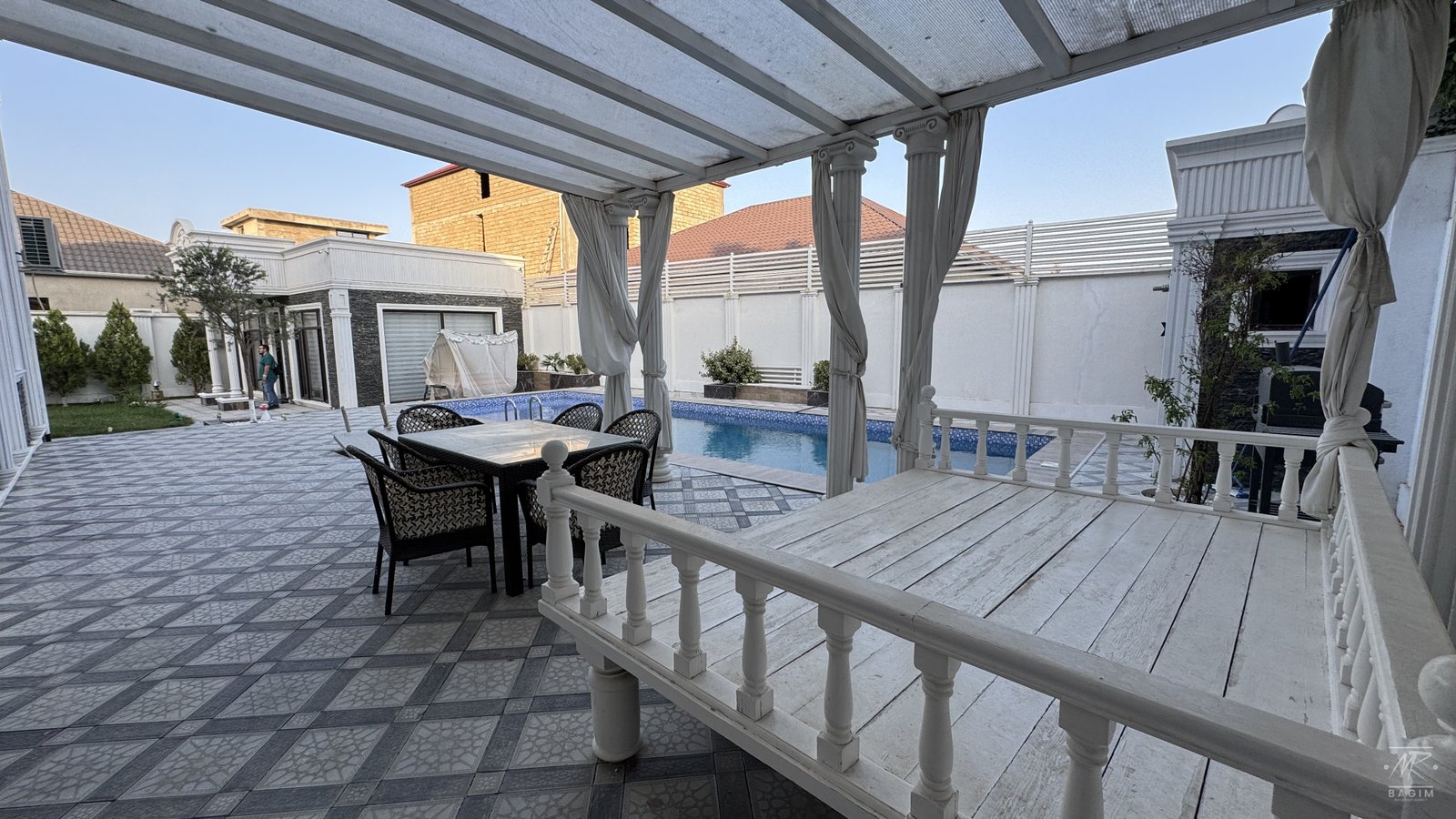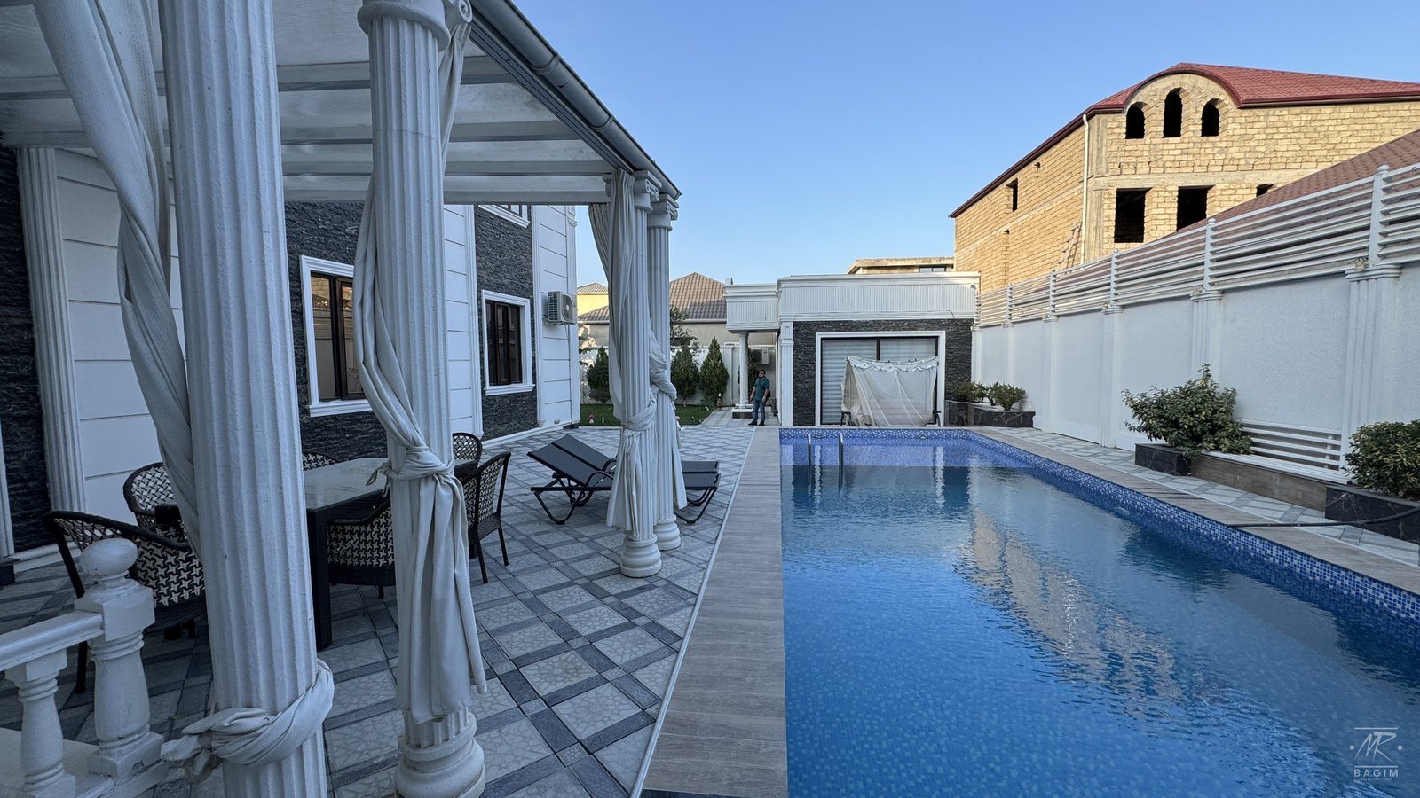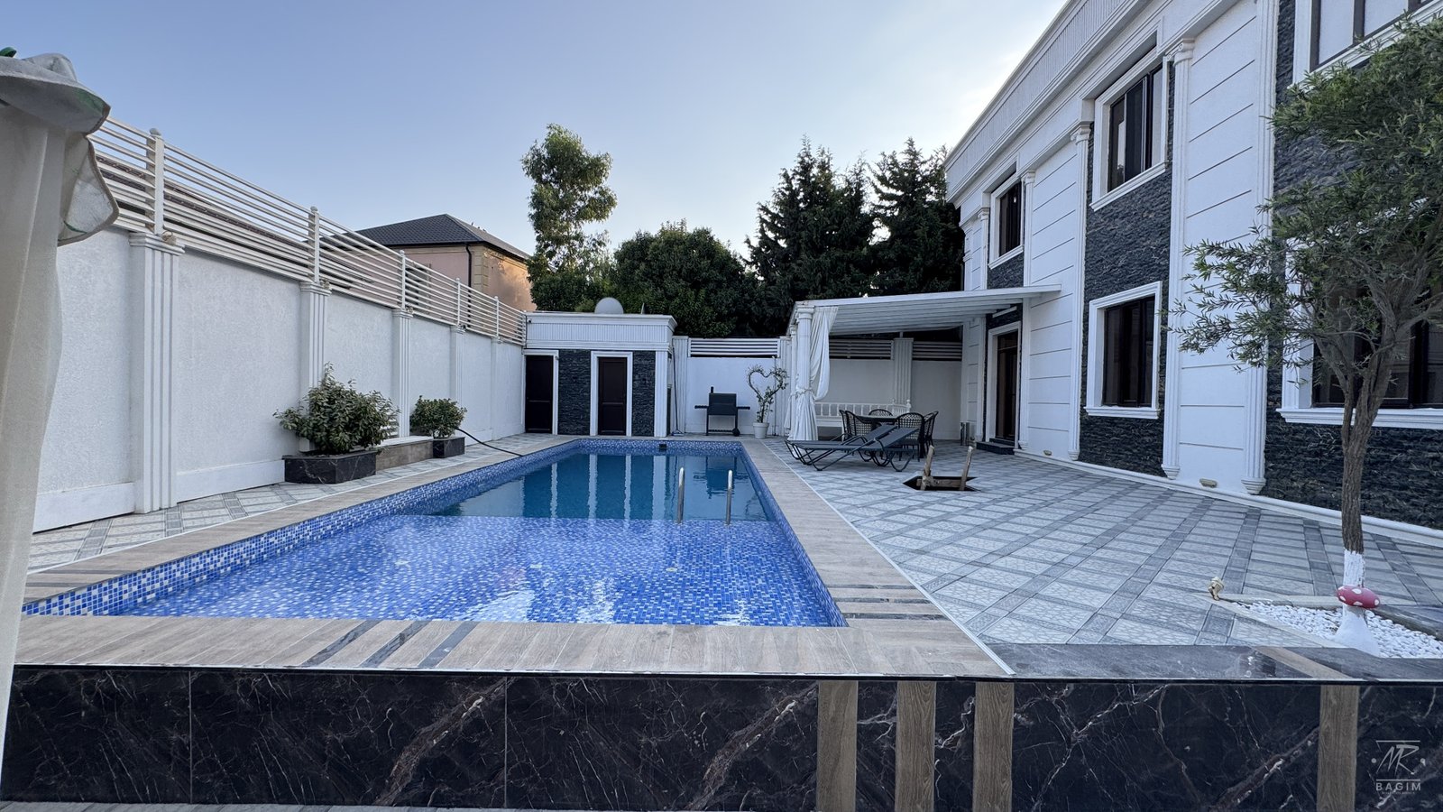 Həyətdə açıq və qapalı hovuzlar, geniş yay mətbəxi (besedka), terrasa çıxış, yaşıllıq və müxtəlif meyvə ağacları mövcuddur. İstər yay, istərsə də qış aylarında ailəvi istirahət üçün mükəmməl şərait yaradılıb.